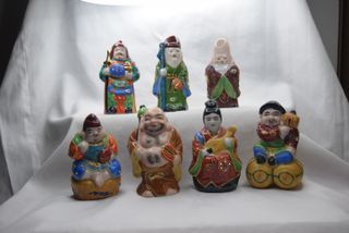 Conjunto de siete figuras decorativas de los dioses de la suerte japoneses. - Figuras de cerámica con vestimentas coloridas. - Diseños detallados y tradicionales. - Ideales para coleccionistas o decoración.