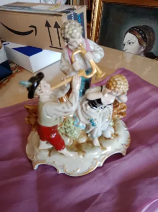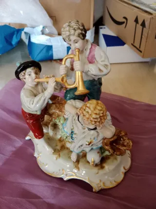 Preciosa figura de porcelana con niños músicos y detalles dorados. - Figuras de porcelana. - Niños tocando instrumentos. - Detalles en dorado.