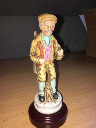 Figura decorativa vintage de un hombre con gorra y escopeta. Ideal para coleccionistas. - de 17 cm - Detallada figura de cerámica. - Vestimenta de época con chaleco y pañuelo. - Base de madera oscura.