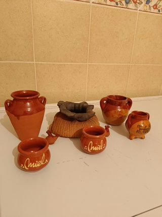 Conjunto de figuras decorativas de barro, hechas a mano. - Piezas de cerámica con acabado rústico. - Diseños variados, ideales para coleccionistas. - Incluye dos pequeñas vasijas con la palabra Miel escrita. Todo el lote 5€