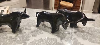 En venta 3 Figuras de toro realizadas en cerámica y de dimensiones 20cm de largo y aprox. 9 cm de alto. Unidades sueltas 20€. Lote de las 3 unidades 45€.