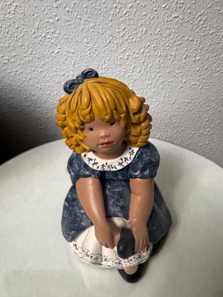 Figura decorativa de escayola, hecha a mano. - Diseño de niña con trenza. - Vestido azul y amarillo. - Ideal para coleccionistas o como detalle decorativo.