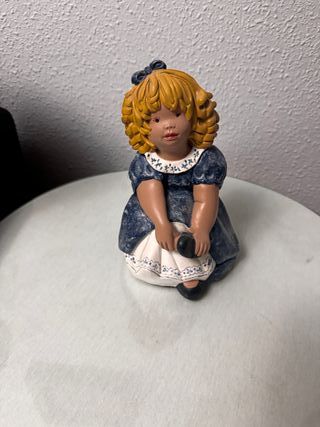 Figura artesanal de escayola, pintada a mano con gran detalle. - Diseño de una niña con vestido azul y blanco. - Lazo azul en el pelo. - Zapatos negros. - Adorno floral en el cuello del vestido.