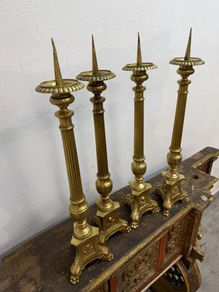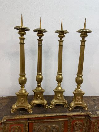Antiguos 4 candeleros con relieves en las bases todo en bronce S. XIX. Medidas: 55cmTelefono. 685110389 Antigüedades y decoración en Lucena. w. w. w. antiguedadeslucena. com antigüedades, decoración y colecciones de todas las categorías muebles, espejos, ceramicas, puertas, jarrones, figuras, esculturas, religiosos , artesacro, cornucopias (virgenes, cristos...) relojes, baules, porcelanas, cuadros, marcos, lámparas, columnas, armarios... antiguedades de colección en lucena, cordoba,Ref F1708