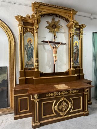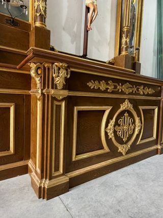 Gran retablo completo, dorado en oro fino con lienzos a los lados y candelabros de plata.Medidas: 2.79m x 95cm x 3.85cm, hueco 2.25m x 1.25mTelefono. 685110389 Antigüedades y decoración en Lucena. w. w. w. antiguedadeslucena. com antigüedades, decoración y colecciones de todas las categorías muebles, espejos, ceramicas, puertas, jarrones, figuras, esculturas, religiosos , artesacro, cornucopias (virgenes, cristos...) relojes, baules, porcelanas, cuadros, marcos, lámparas, rusticos, columnas, armarios... antiguedades de colección en lucena, cordoba,Ref.F1742