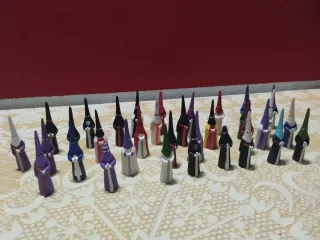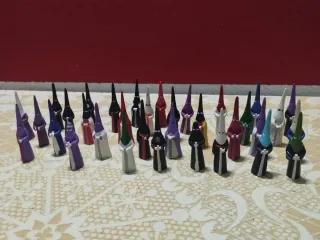 Conjunto de figuras de nazarenos para colección. Representan figuras religiosas con túnicas y capirotes. - Variedad de colores en las túnicas. - Diseños detallados de las figuras.