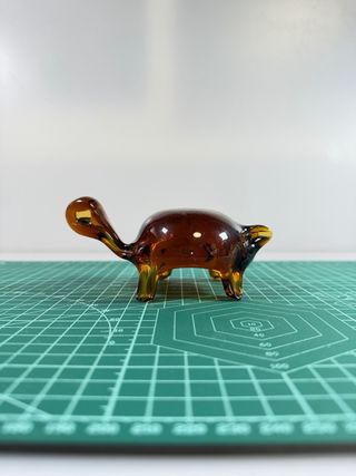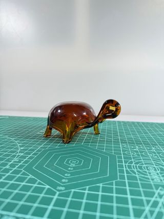 Figura artesanal de cristal con forma de tortuga, elaborada en vidrio de tono ámbar. Pieza decorativa hecha a mano, con un diseño muy detallado y un acabado brillante. Ideal para coleccionistas, decoración de estanterías o como pequeño objeto ornamental.