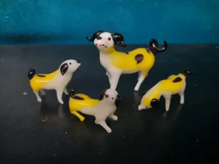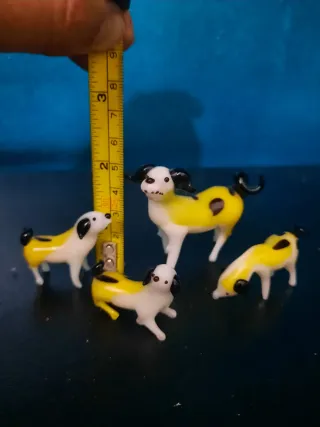 Conjunto de cuatro adorables figuras de perros hechas de cristal de Murano. Cada pieza es única y detallada, aportando un toque de elegancia y encanto a cualquier espacio. - Material: Cristal de Murano - Diseño: Perros con detalles en amarillo y negro - Cantidad: 4 figuras