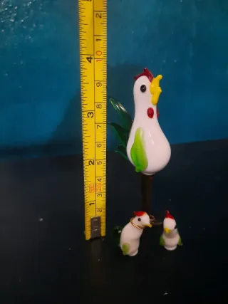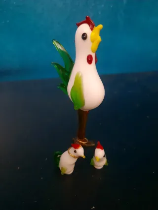 Conjunto de figuras de cristal soplado, inspiradas en gallinas y pollitos, con un diseño delicado y colorido. - Material: Cristal de Murano. - Incluye una gallina grande y dos figuras más pequeñas. - Detalles en rojo, amarillo y verde. Destacar que la gallina grande tiene un defecto en la boca mirar fotos.