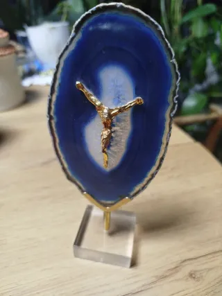 Figura de Cristo sobre una lámina de ágata azul con base de metacrilato. - Lámina de ágata con tonos azules y blancos. - Figura de Cristo en dorado. - Base transparente de metacrilato.