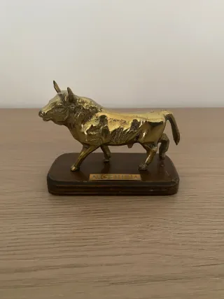 Figura decorativa de toro en metal (latón/bronce con pátina envejecida) sobre base de madera con placa “ARGENTINA”. Mide aproximadamente 10 cm de largo. Pieza ideal para decoración rústica, despacho, estantería o colección de figuras de animales / recuerdos de viaje. Se encuentra en buen estado, con ligera pátina y marcas propias del paso del tiempo que le dan carácter (ver fotos). Perfecto como detalle decorativo o regalo original. 📏 Medidas: ~10 cm de largo 🎨 Color: dorado envejecido 🏷 Incluye base de madera original
