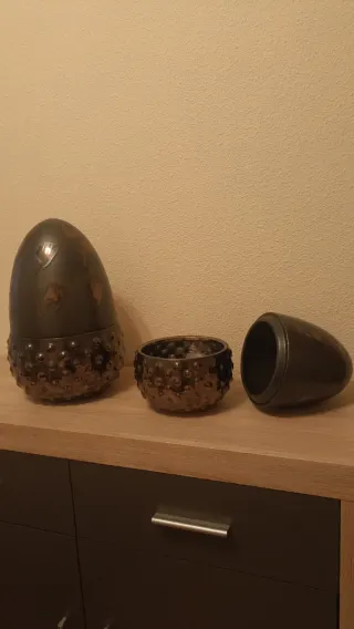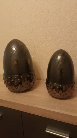 Dos figuras decorativas con forma de bellotas. Su diseño es llamativo y original. *Se pueden vender por separado. Medidas: Bellota grande 43 x 28 Bellota pequeña 35 x 21 - Base texturizada con acabado abombado. - Cuerpo liso con detalles metálicos.