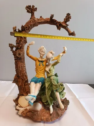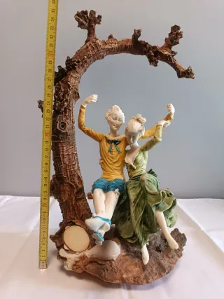 Preciosa figura decorativa de marmolina estilo rococó que representa una romántica pareja en columpio bajo árbol. Pintada a mano pero sin terminar. Ideal para amantes de manualidades para personalizar a su gusto.