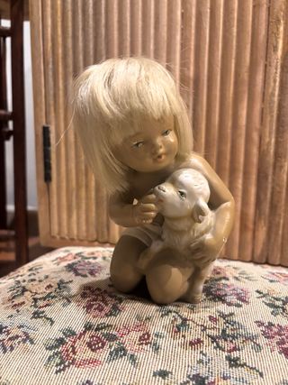 Figura decorativa de un niño rubio abrazando a un cordero blanco. Ideal para coleccionistas o como adorno. - Material: Pasta o resina. - Cabello rubio sintético. - Detalles pintados a mano.