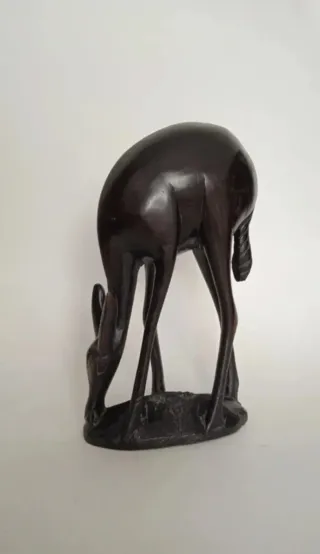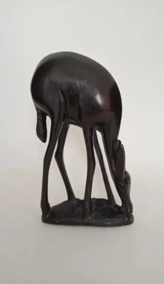 Figura tallada en madera, creo que es de caoba, tiene bastantes años de antigüedad, puede tener entre 30-50 años o más. Mide 19,5 cm de alto, 11 de largo y 5 de ancho