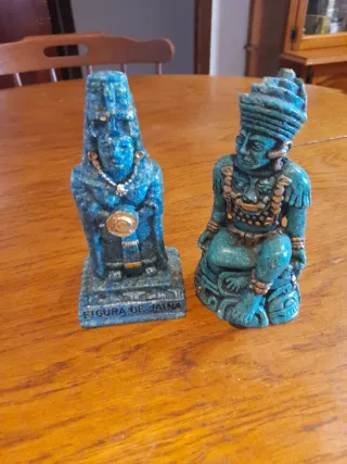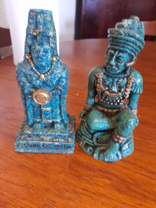 Conjunto de dos figuras decorativas con un estilo inspirado en la cultura azteca. Cada figura tiene un acabado en tonos azules y dorados. - Figura de pie con tocado alto y collar. - Figura sentada con tocado y vestimenta detallada. - Base de la figura de pie con inscripción FIGURA DE JAIÑA.
