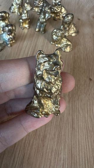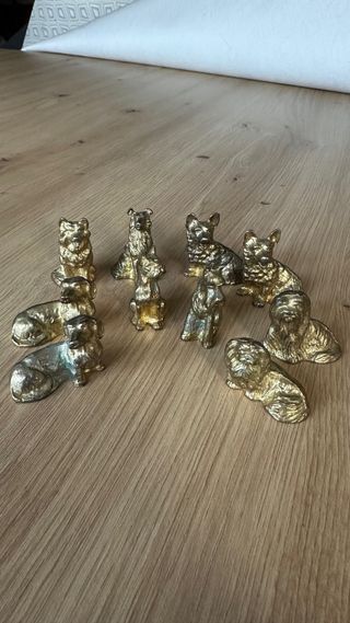 Conjunto de figuras decorativas con forma de perros. Son ideales para añadir un toque especial a cualquier rincón. - Material metálico con acabado dorado. - Variedad de razas y poses. - Diseño detallado. Buen estado general, con pátina propia del paso del tiempo. No son de oro ni de plata. Sólo se vende el conjunto entero. Escucho posibles ofertas razonables.