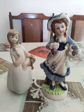 Conjunto de dos figuras decorativas de porcelana, ideales para añadir un toque de encanto a cualquier espacio. Alto: 16 y 19 cm - Figura de mujer con vestido blanco y cesta. - Figura de mujer con sombrero, vestido azul y cesta de frutas.