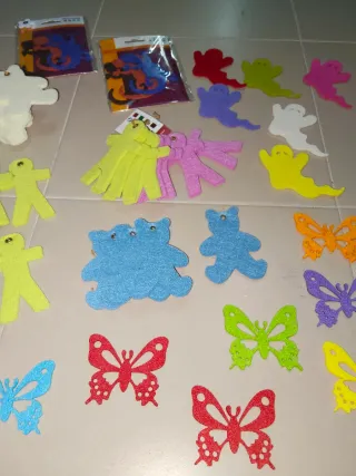 Lote de más de 40 figuras de fieltro. - Figuras de fantasmas en varios colores: rojo, verde, morado, blanco, amarillo y rosa. - Figuras de personas en colores amarillo y rosa. - Figuras de osos en color azul. - Figuras de mariposas en colores naranja, morado, verde, rojo y azul. - Figuras de lagartos en paquetes. - Figuras de fieltro blanco. - Todos tienen un grosor de 4cm aprox excepto los lagartos que tienen menos grosor.
