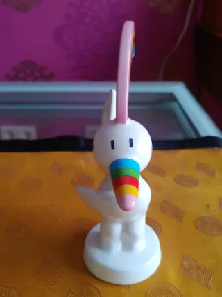 Figura de cerámica del personaje Curro, mascota de la Expo 92. - Diseño blanco con detalles de arcoíris en el pico y la cabeza. - Base redonda blanca.