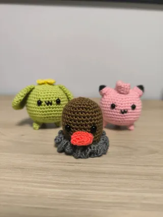 Lote de 3 mini Pokémon hechos a mano. -Popocco (verde) -Digda (marrón) -Clefairy (rosa)