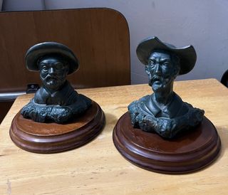 Conjunto de dos figuras decorativas, representando a Don Quijote y Sancho Panza. Cada figura está montada sobre una base de madera pulida. - Base: Madera - Personajes: Don Quijote y Sancho Panza