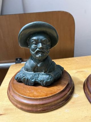 Estatuilla Miniatura decorativa de la Figura del personaje Don Quijote de la Mancha (Cervantes). -Estatua Metálica - Base de madera barnizada. - Medidas: 25 cm alto x base de 9 cm - Falda de terciopelo rojo y leotardos de plástico rojos. - En el libro se puede leer "En un lugar de la Mancha...". El libro se puede girar un poco. - Comprada en Boutique de la plaza Mayor de Salamanca. NUEVA, SIN ESTRENAR. Especial coleccionistas.