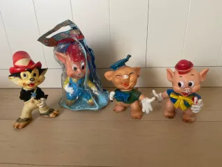 Set de figuras de goma de los 3 Cerditos y el Lobo de la marca Famosa. Incluye 4 figuras. El cerdito sabio todavía en su envoltorio original de los años 60 y sin abrir. A estrenar. Miden 24 cm aproximadamente. - Figuras de los personajes clásicos. - Material de goma. - Ideal para coleccionistas.