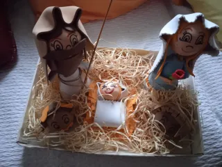 Adorno de belén realizado en goma eva. - Figuras de estilo fofucha. - Incluye pesebre con paja decorativa.