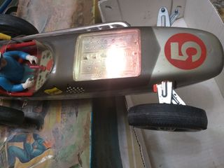 Coche de carreras antiguo de la marca JYESA, modelo 358. - Diseño de coche de competición. - Detalle de número 5 en el lateral. - Cabina transparente con figura de piloto. - Ruedas de goma.bolido de jyesa años 70 para restaurar o donante la lus del motor se enciende pero no acciona el coche una rueda suelta y caja original algo deteriorada la fotos forman parte dela descripcion