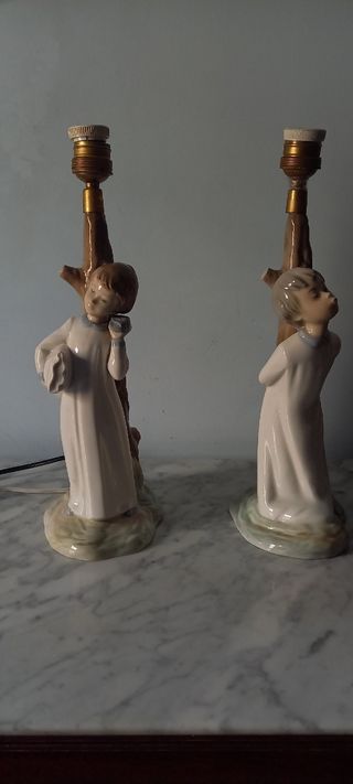 Par de lámparas de la marca Zaphir, fabricadas por Lladro en los años 70. Representan figuras de niños junto a un árbol. - Diseño de figuras de porcelana. - Base con motivos de naturaleza. - Incluye portalámparas.