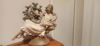 Preciosa figura de porcelana de Lladro. Representa a una mujer sentada entre ramas y flores. - Diseño delicado y detallado. - Tonos pastel suaves. -Medidas: Alto 40 ancho 45 contorno 93