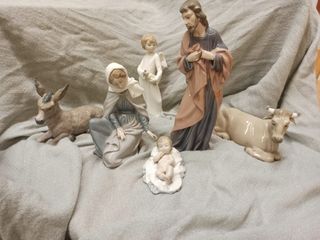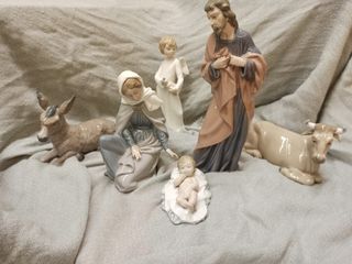 Conjunto de figuras para belén de la marca Lladro. Representa la escena de la Natividad con varios personajes y animales. - Figura de San José. - Figura de la Virgen María. - Figura del Niño Jesús en la cuna. - Figura de un ángel. - Figura de un burro. - Figura de una vaca.