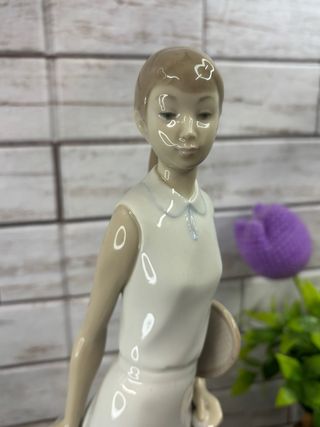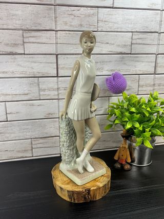 Figura de porcelana de una tenista de Lladró. Representa a una joven deportista con su raqueta. - Diseño detallado de la figura. - Base decorada con elementos naturales. - Fabricado en España. Descatalogado en 1974. - Escultor: Vicente Martínez