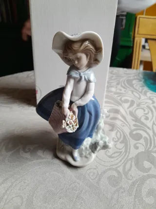 Figura de porcelana Lladró que representa a una niña con un sombrero y una cesta de flores. - Diseño delicado y detallado. - Tonos pastel en la vestimenta y la cesta. - Base con textura que simula naturaleza.