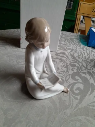 Figura de porcelana de un niño leyendo. - Diseño delicado y detallado. - Tonos suaves y acabado brillante.