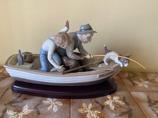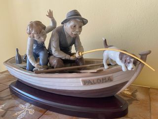 Figura decorativa de porcelana esmaltada y policromada de Lladró. Representa un abuelo y nieto con el perro pescando en una barca de nombre Paloma. Porcelana de 1983 Incluys una elegante base de madera. Está en perfecto estado de conservación. No se realizan envíos