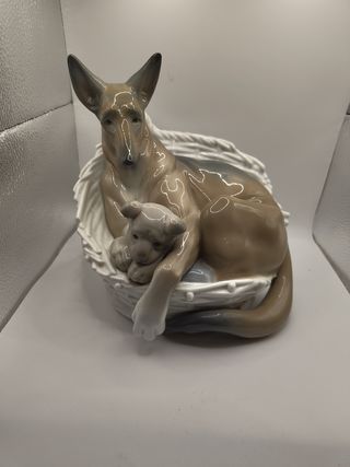 Preciosa figura de porcelana Lladró, modelo 4731, titulada "Linda con su cachorro". Representa una elegante perra greyhound acurrucada con su cachorro, en tonos tierra y grises esmaltados. Pieza original, fabricada en España, con sello en la base y número de serie marcado en relieve. Ideal para coleccionistas o como regalo de alta calidad decorativa. Muy raro .En perfecto estado, sin roturas ni restauraciones. Detallismo y ternura en una de las composiciones más apreciadas de la firma.