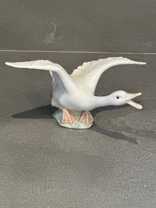 Figura de porcelana de un pato corriendo de la marca Lladró. - Diseño detallado. - Acabado blanco y verde pálido.