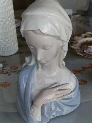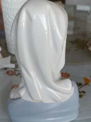 Busto, Figura de porcelana de la Virgen María, estilo Lladró. Representa una escena serena y emotiva. - Detalle de las manos. - Túnica en tonos azules y blancos.