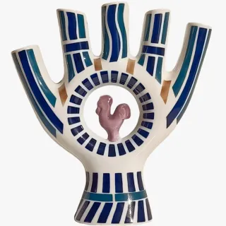 🔴Sargadelos: Pieza decorativa con forma de mano de cinco dedos. Presenta un diseño con motivos geométricos en azul y detalles en color ocre, con un pequeño gallo rosa en el interior. 🔺Figura, jarrón o candelabro. 🔺Porcelana pintada a mano. 📏Medidas: 🔸Alto: 24 cm. 🔸Ancho: 22 cm. 📦Realizamos envíos 🏷️Etiquetas: Cerámica, Porcelana, Sargadelos, Galos, Pontecesures, Galicia, Figura, Escultura, Arte, Decoración, Coleccionismo, Antigüedades, Vintage, Retro, Lladró, Luis Seoane, Isaac Díaz Pardo...
