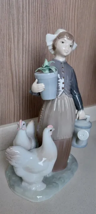 Figura de porcelana Lladró "Jardinería con gallinas. Le faltan dos horitas.
