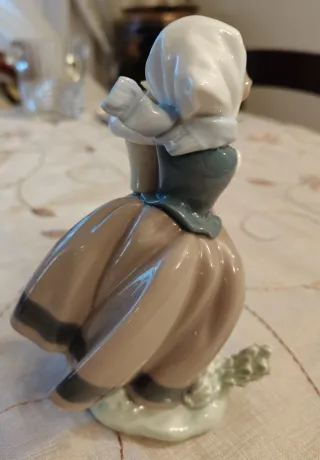 Marca: LLADRÓ • País: España (Valencia) • Material: porcelana esmaltada Lladró • Época: años 70–80 • Serie/estilo: figura costumbrista femenina (campesina/joven con pañuelo y ave). Producción de catálogo, no edición limitada ni pieza artística singular. • Marca en la base: logotipo azul de Lladró correcto para esa época. Los números incisos son códigos de molde y control, no aumentan valor. altura 20 cm