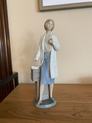 Figura de porcelana de la marca Nao by Lladró, representando a una doctora. Una pieza delicada y elegante en perfecto estado - Diseño detallado de una profesional de la salud. - Acabado en porcelana de alta calidad. - Figura de 36 cm de altura