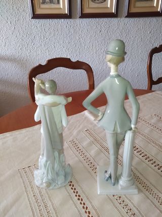 Conjunto de dos figuras de porcelana con acabado brillante, inspiradas en el estilo Lladro. Representan una escena de pareja. Bellas y refinadas figuras decorativas "Vintage" de estilo Lladró, acabado cristalino con tonalidades pastel, adquiridas en los años 60. Conservadas en excelente condición. Dimensiones: 26 cm de alto y 25 x 16 cm de base. Peso: 1450 gr cada una. Se trata de una pareja burguesa del S. XIX en porcelana brillo. El conjunto de las 2 figuras tiene un precio unificado de 99 €. Se hacen envíos con total seguridad utilizando 2 cajas de diferente tamaño. Ver video subido a Youtube, URL impresa en la última foto.