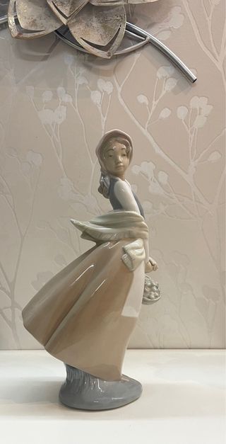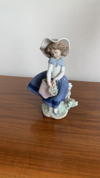 Figura de porcelana Lladró de una joven con cesta de flores. 23 cm de altura. - Diseño detallado de la figura. - Cesta con flores. - Base con acabado verde. NO envío. Entrega en mano y pago en efectivo en Zaragoza.