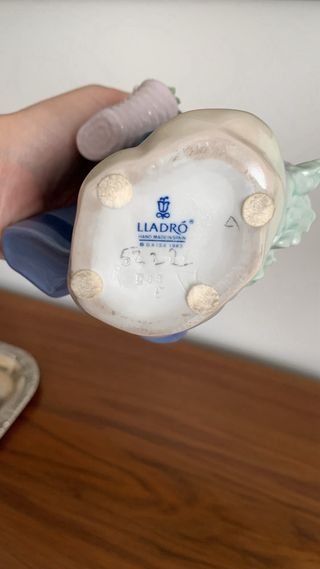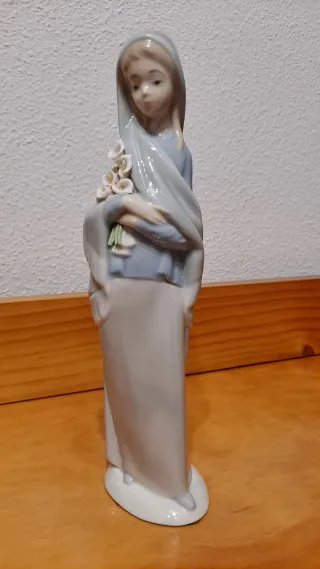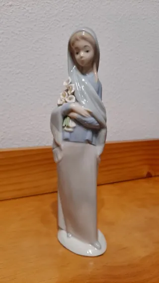 Preciosa figura de porcelana Lladró, con sello azul. Representa a una niña con flores. Es una pieza delicada y elegante. - Figura de porcelana Lladró. - Sellada en azul. - Representación de una niña con flores. - se rebaja al 70% por defecto ramo que lleva en las manos, apenas apeciable