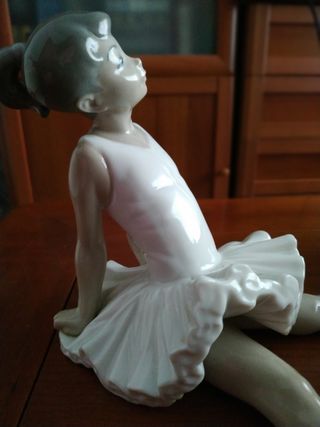 Preciosa figura de porcelana de una bailarina de Lladró. Representa a una bailarina sentada con un tutú. - Figura de porcelana. - Diseño detallado de bailarina. Disponible en la web de Lladró a 475€ (niña ballet mirando zapatillas)