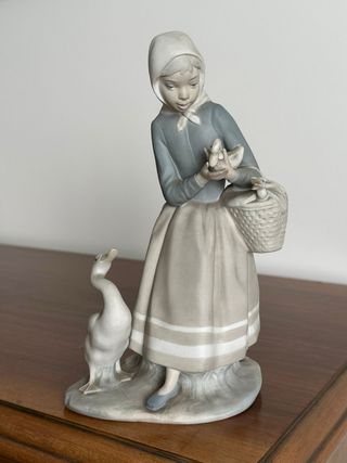 Preciosa figura de porcelana Nao de Lladró, representando a una niña sosteniendo un pato. Es una pieza delicada y encantadora, ideal para coleccionistas. Medidas: alto 27 cm. ancho 8 cm. profundo 6 cm. - Figura de porcelana. - Representa a una niña con un pato. - Perfecta para decorar.