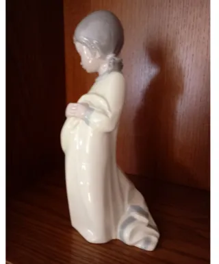 Figura de porcelana que representa a una mujer en actitud de rezar. Data de los años 70, imita el estilo de las figuras de Lladró pero no tiene sello ni está numerada.